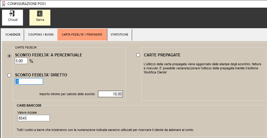 Per la gestione delle Carte Fedeltà/Prepagate ad ogni cliente verrà assegnato un codice di 13 cifre da stampare/inviare come codice a barre.