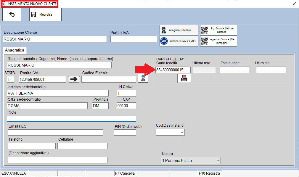 Il codice potrà essere digitato/scansionato al momento dell'inserimento del cliente acquisendolo dalla carta fedeltà prestampata.