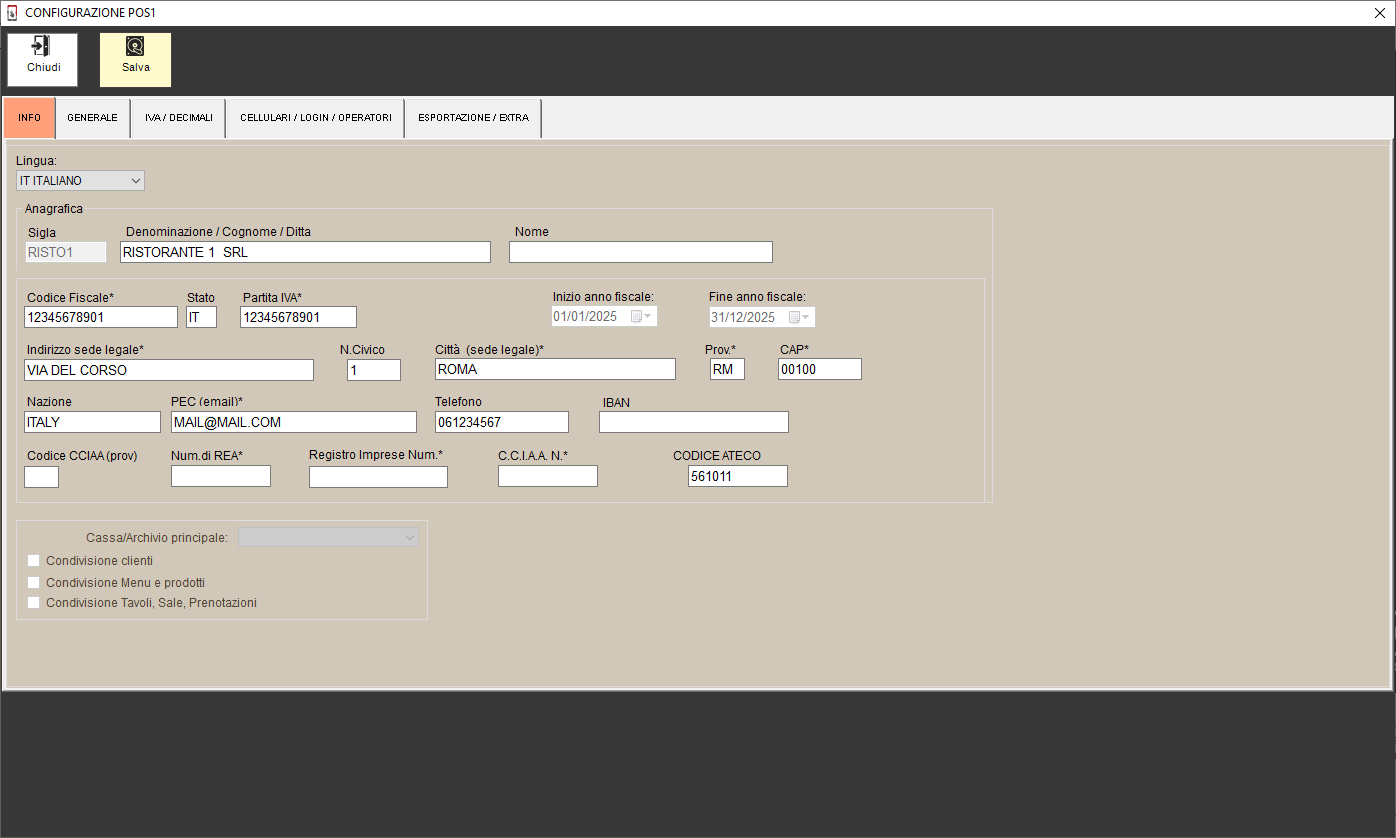 Utilizzare la scheda "INFO" per digitare l'anagrafica della vostra attività , (Denominazione sociale o Cognome, Nome, Codice fiscale, Partita IVA, etc.
