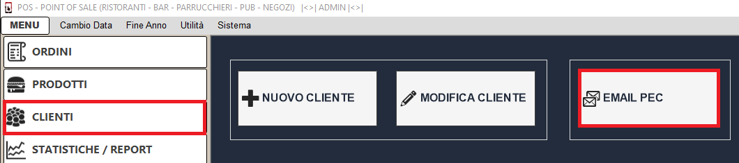 Per inviare le email ai clienti oppure a gruppi di clienti usare la funzione EMAIL PEC (vedere la figura)