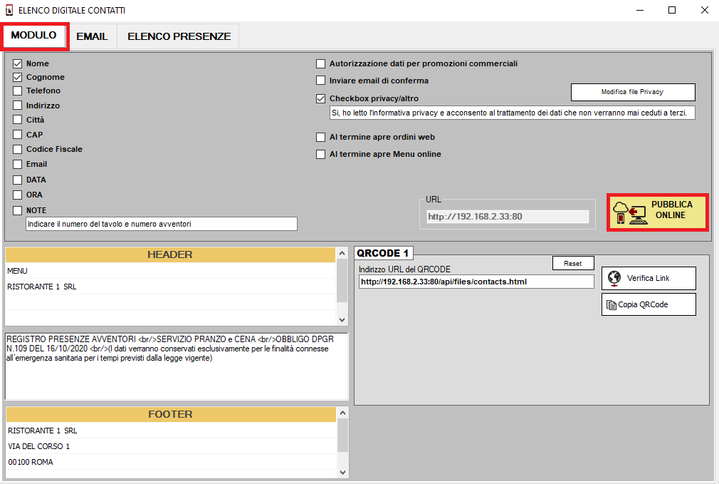Serve per selezionare una serie di dati da richiedere ai clienti per es. per redigere il registro digitale degli avventori. Con questa funzione sarà possibile far inserire online o su un pc messo a disposizione dei clienti i dati necessari per la tenuta del registro avventori. I dati inseriti dai clienti saranno memorizzati e quindi potranno essere visualizzati nella scheda "ELENCO PRESENZE"