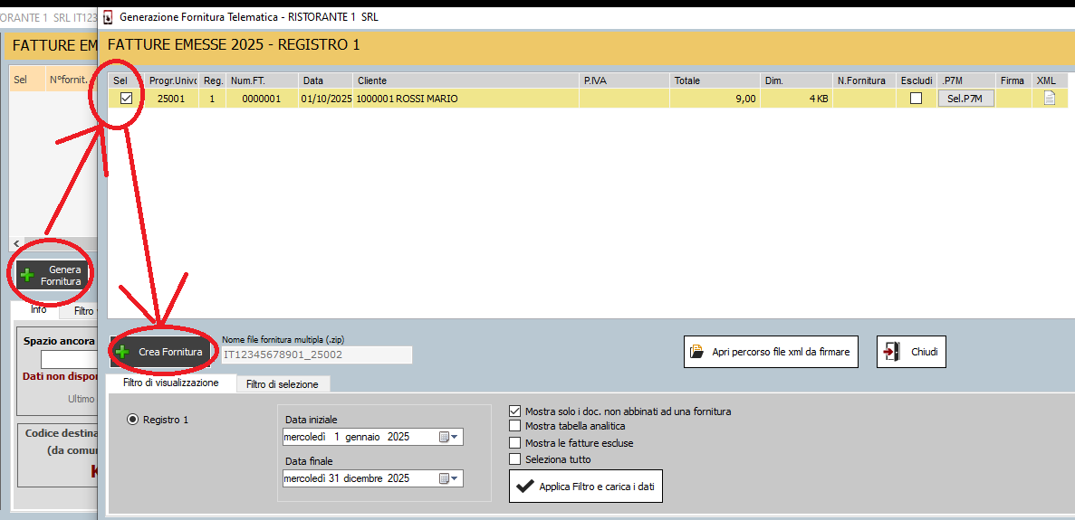 A questo punto la fornitura sarà generata e potrà essere selezionata ed inviata al SdI come indicato nella figura.