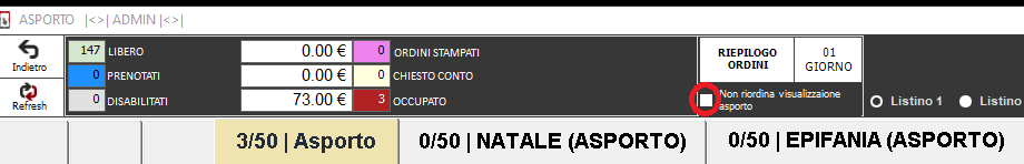 Nell'asporto sono presenti dei "tavoli" virtuali che corrispondo agli ordini da asporto inseriti/ricevuti. Questi "tavoli" vengono ordinati automaticamente giorno per giorno in base al all'orario di consegna. E' possibile disattivare questa la funzione di riordino automatico cliccando sull'apposito flag "Non riordina visualizzazione asporto" (opzione che alcune volte si utilizza per memorizzare meglio gli ordini da asporto).