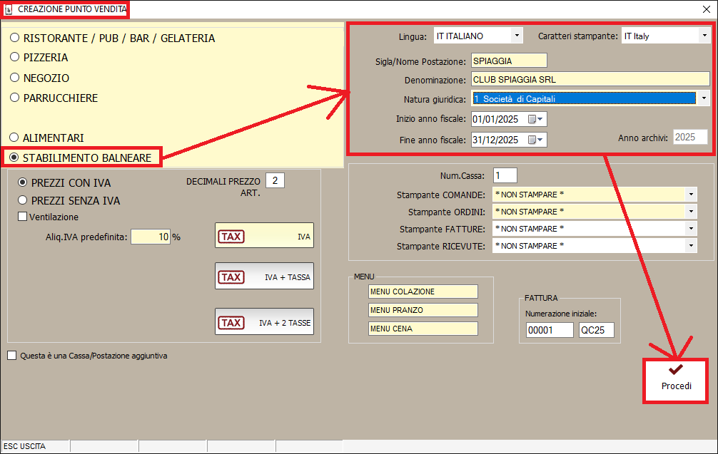 Per utilizzare la funzione relativa alla gestione delle spiagge occorre creare un punto vendita con l'apposita opzione "STABILIMENTO BALNEARE".