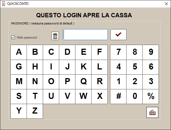 Inizialmente la password di accesso (livello di accesso 1) è lasciata vuota, ma è consigliabile modificarla ed impostare una password di accesso per i vari utenti con privilegi diversi es. amministratore (1), direttore di sala (2) o cameriere (5).