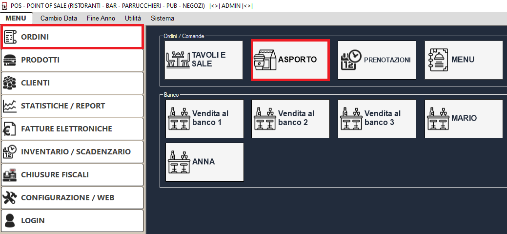 Dal pc accedere al menu' asporto mediante l'apposito bottone "ASPORTO".